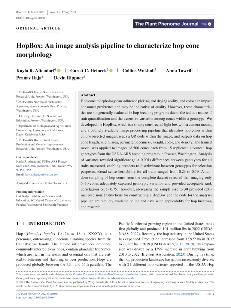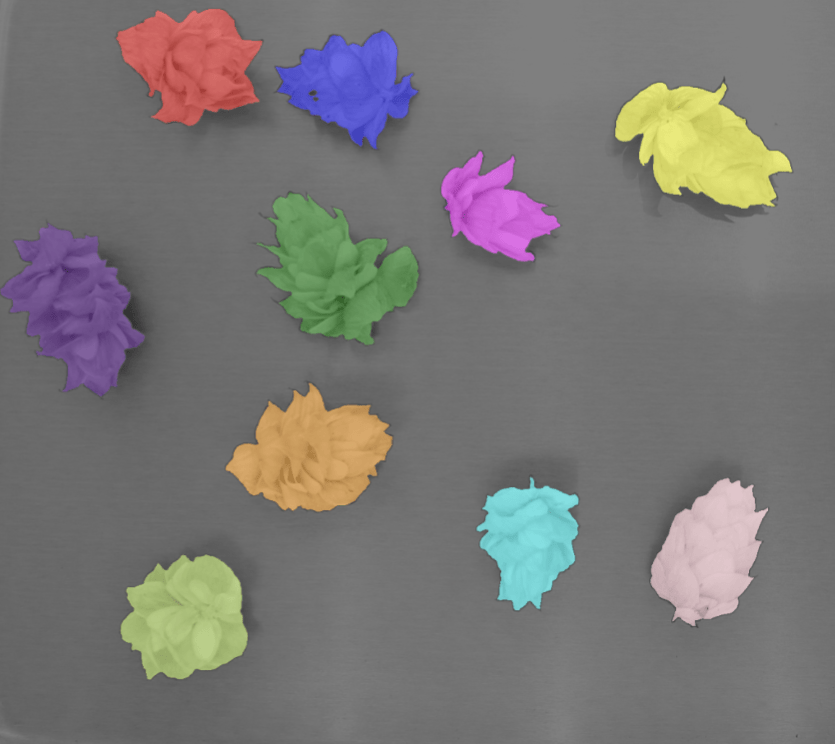 Grape leaves identified, counted, and quantified by deep learning.Hops identified, counted, and quantified by deep learning.An individual hop segmented by deep learning for color evaluation.